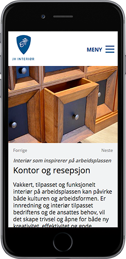 Ettersom JH Interiør hadde en side fra oss før ble dette en redesign hvor vi beholdt mye av det som allerede fungerte bra på den forrige siden. Vi laget en løsning som var fleksibel og likevel enkel å bruke. Behovet for å kunne vise mange eller få bilder, samt video var en av utfordringene. De fikk og en dekket behovet for å knytte forsiden til facebook siden sin.